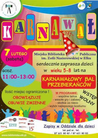 7.02. W sobotę, 7 lutego, od 11.00 do 13.00 w bibliotece odbędzie się Bal Przebierańców dla dzieci. W programie tańce, zabawy, wybór najlepszego kostiumu. Bal dla dzieci w wieku 5-8 lat.