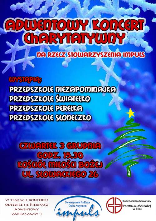 W trakcie koncertu odbędzie się kiermasz świąteczny wraz z ciepłym i słodkim poczęstunkiem. Dochód z koncertu zostanie przekazany na Stowarzyszenie Impuls, pracujące z osobami z autyzmem i zespołem Aspargera.