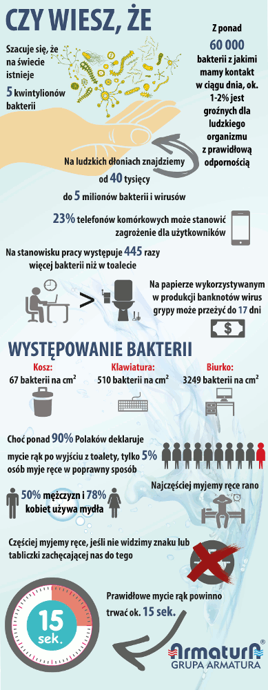 Przypadający na 15 października Światowy Dzień Mycia Rąk, został ustanowiony przez ONZ w celu propagowania regularnego i co ważniejsze – prawidłowego wykonywania czynności higienicznych. Jak podaje Światowa Organizacja Zdrowia, aż 70% zakażeń układu pokarmowego wywoływane jest przez drobnoustroje przenoszone na brudnych dłoniach. A bakterii na ludzkiej skórze nie brakuje – szacuje się, że na rękach możemy znaleźć ich od 40 tysięcy do prawie 5 milionów. Jak uniknąć przykrych konsekwencji zdrowotnych związanych z ich obecnością?